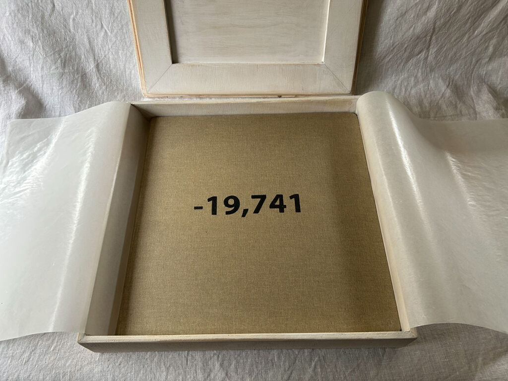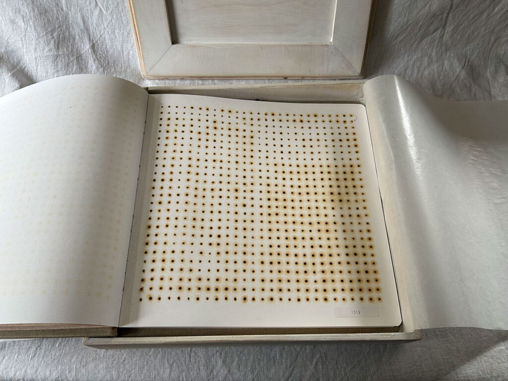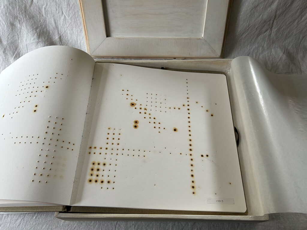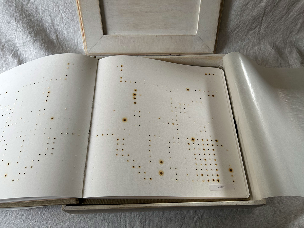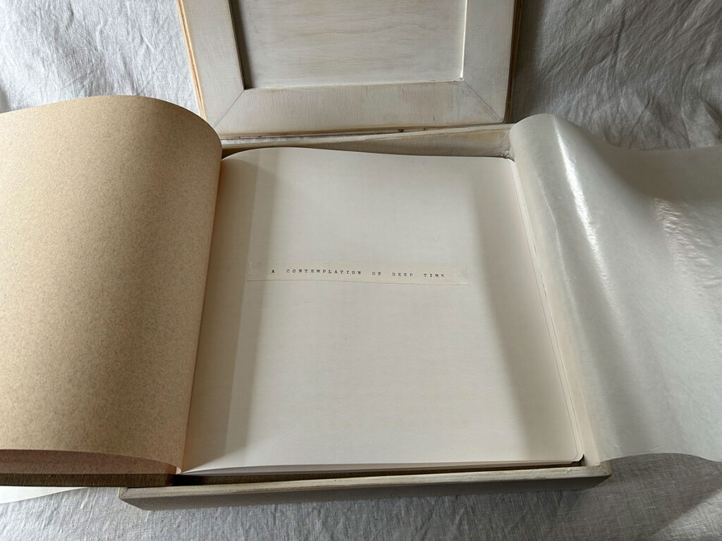 Below: Contemplation of Deep Time. A book project from 2021 with handmade box completed in 2025. Burnt holes across pages represented one per year passing from the year 2021 and regressing to -19,741 BCE. Faye Wilson.